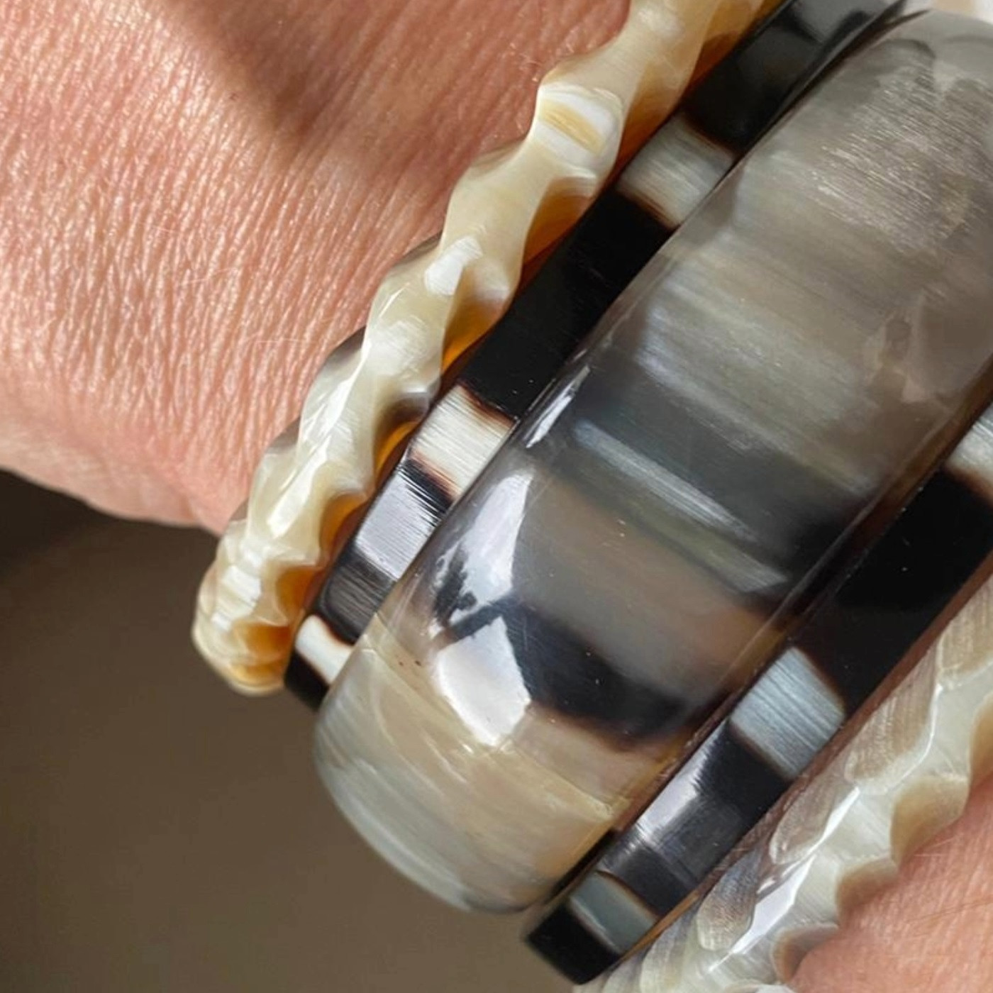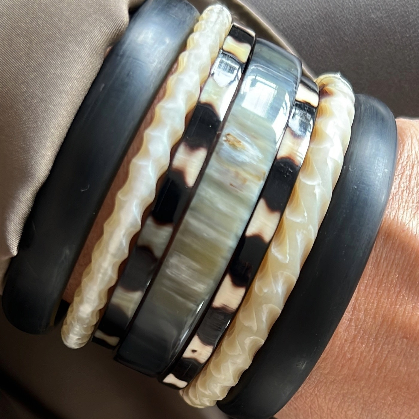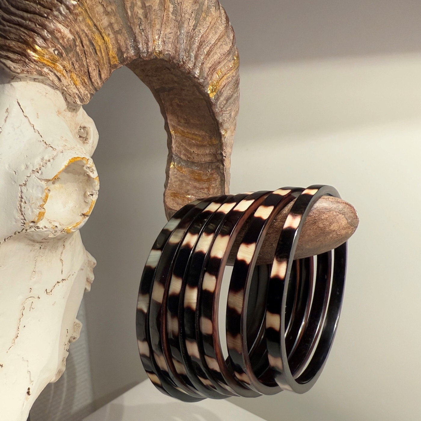 Stijlvolle, handgemaakte buffelhoorn armbanden, met polkadots. 7 stuks.
