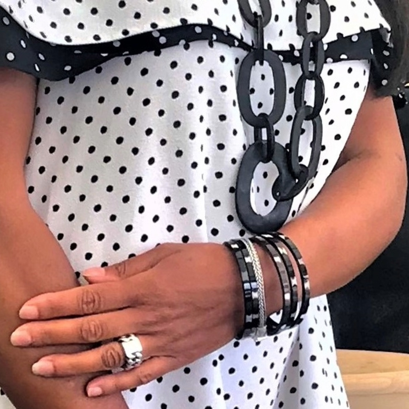 Hoé gaaf zijn deze polkadot armbandjes in een samengestelde set van matte, glanzende, brede armbanden?! Ze 'knallen' eruit!