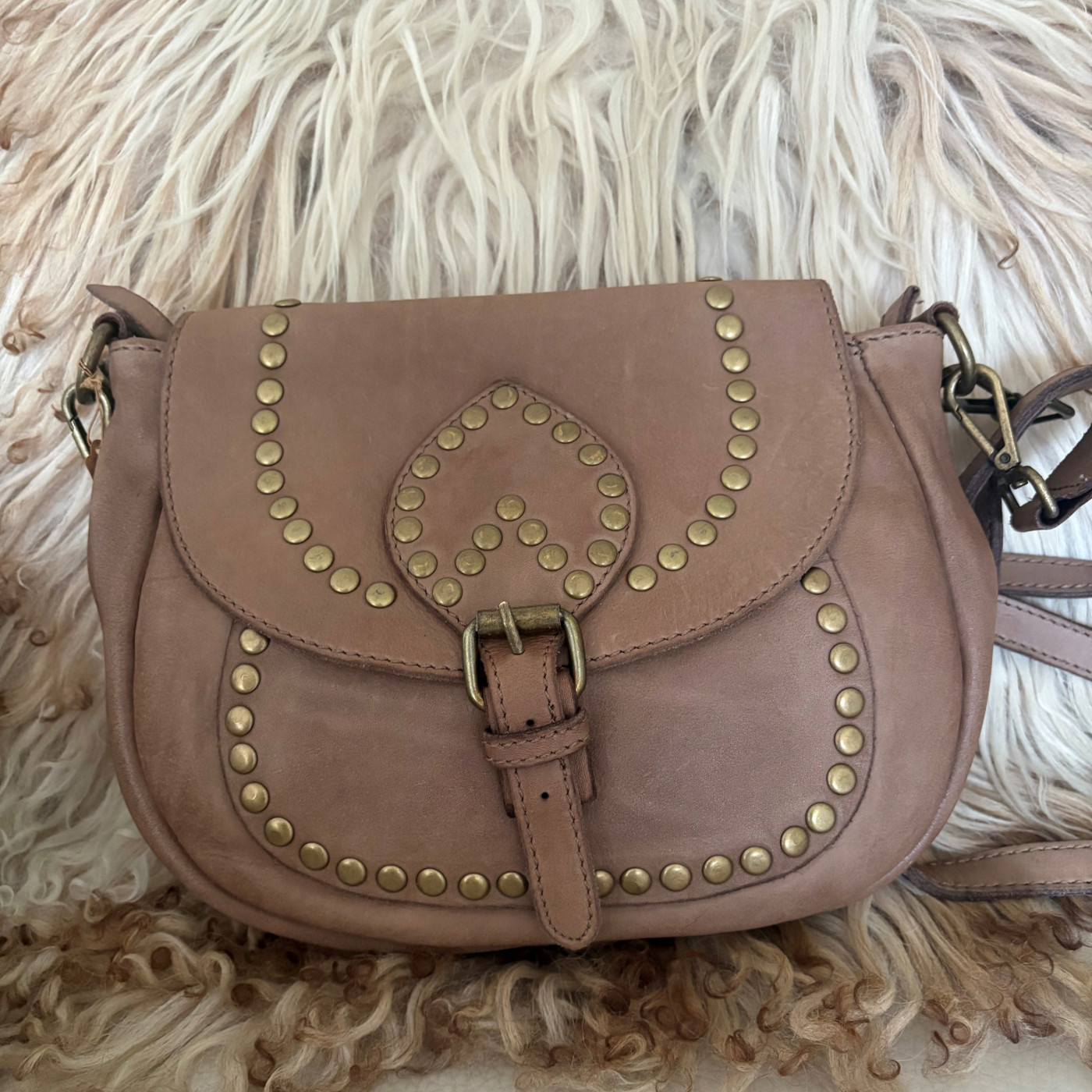 Prachtige, stoere gewassen leren tas met koperen studs. Kleur: camel.