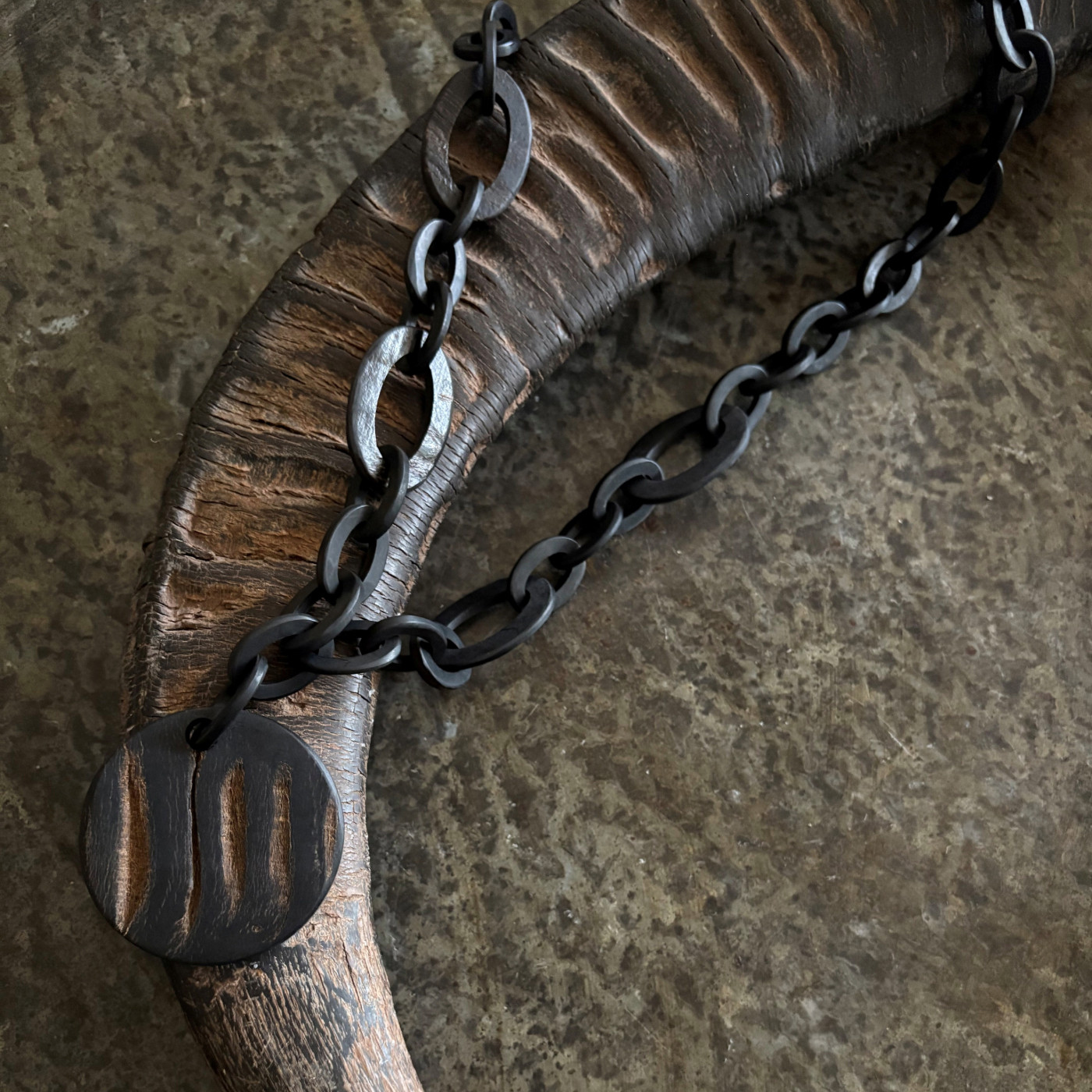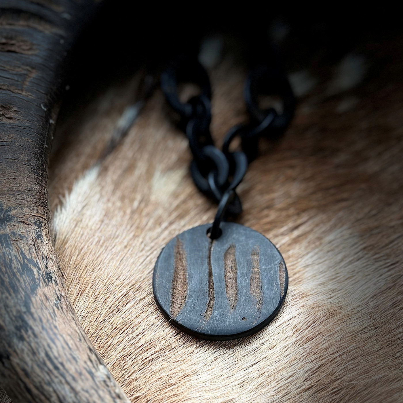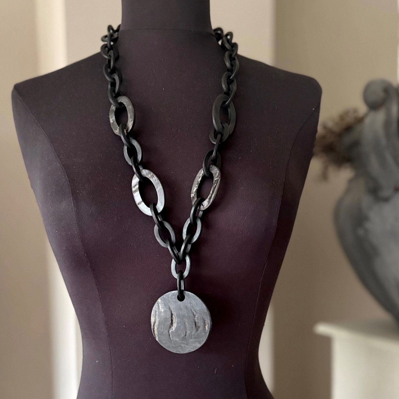 Fantastisch buffelhoorn collier in mat zwart & rough buffelhoorn met een 6 cm ronde hanger.