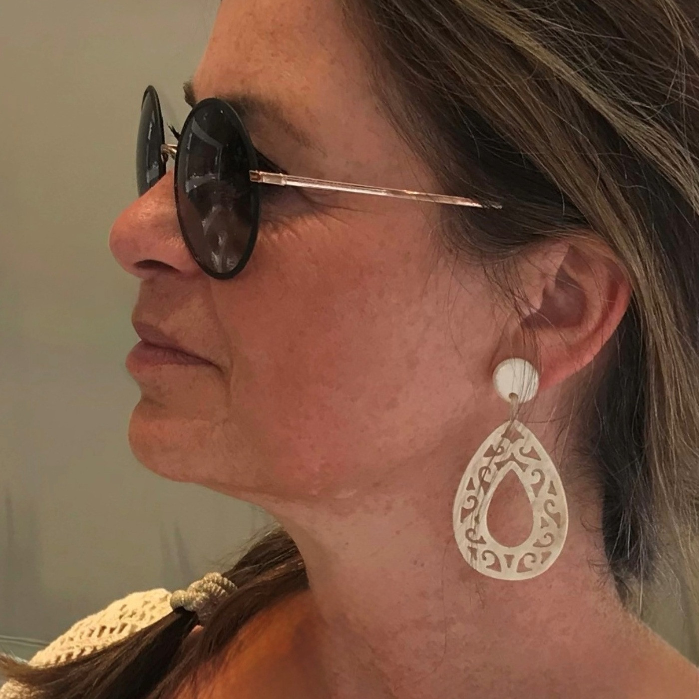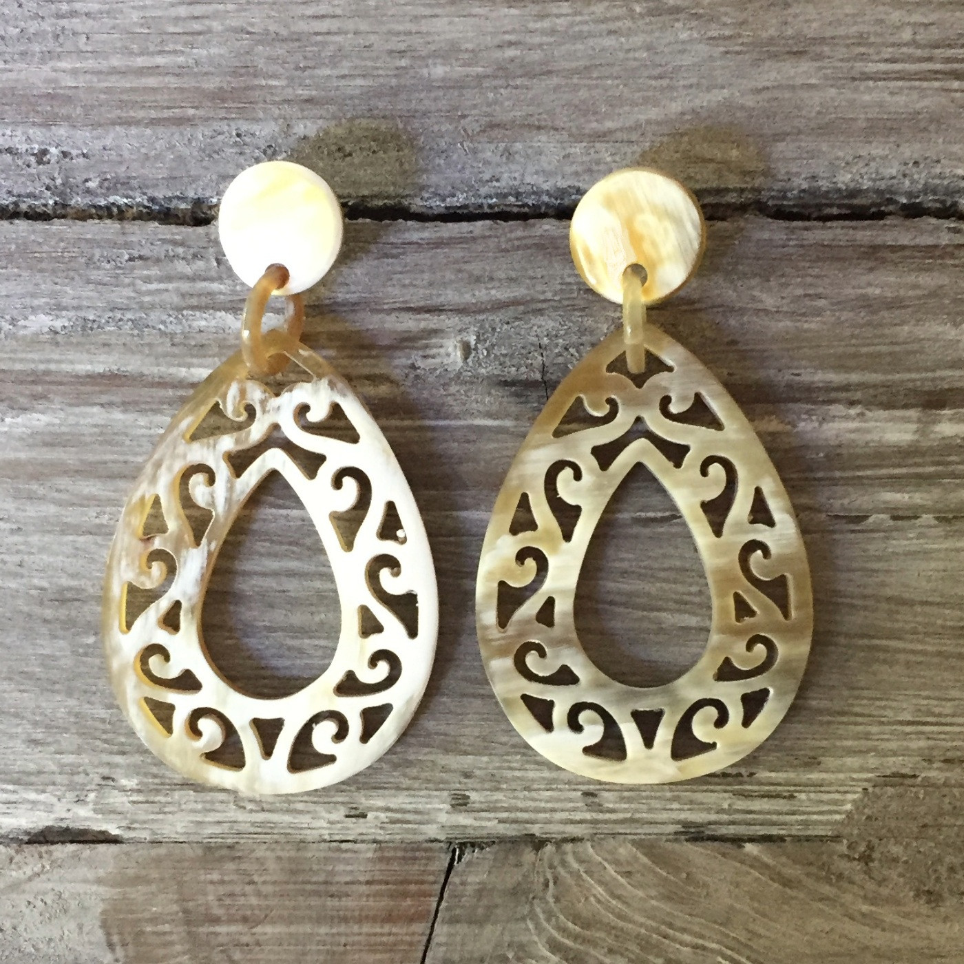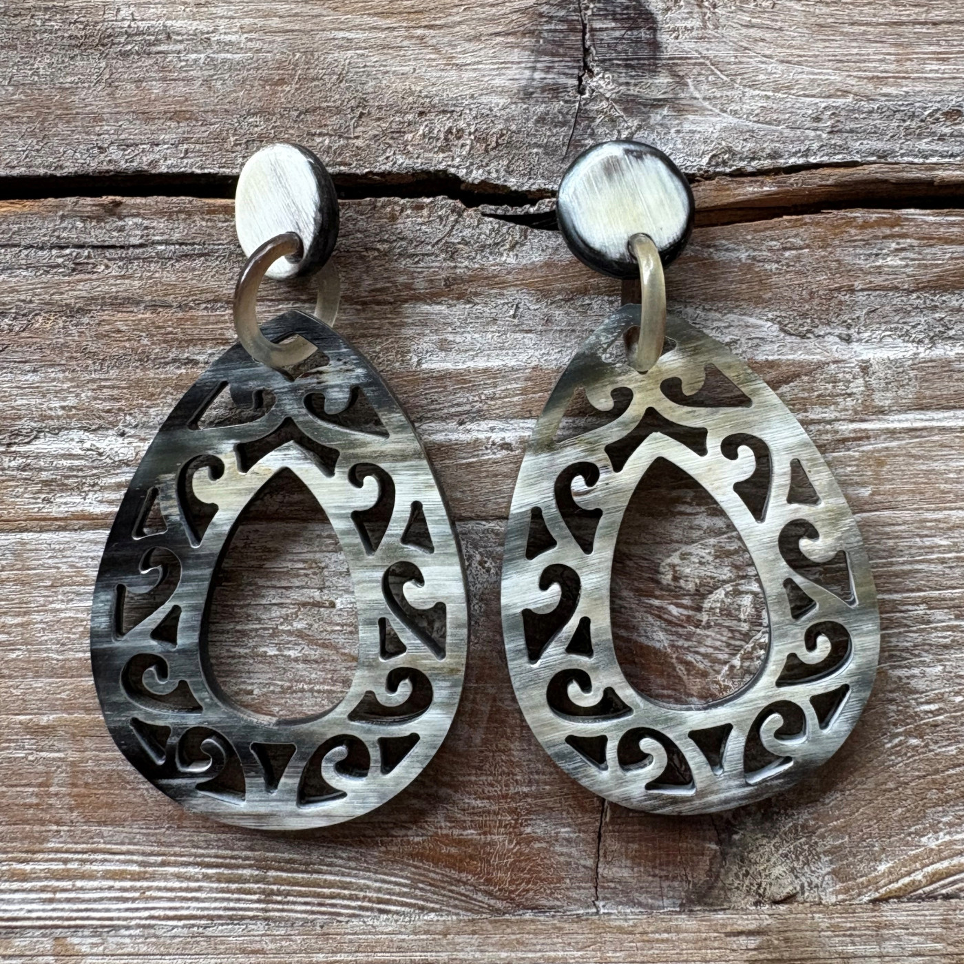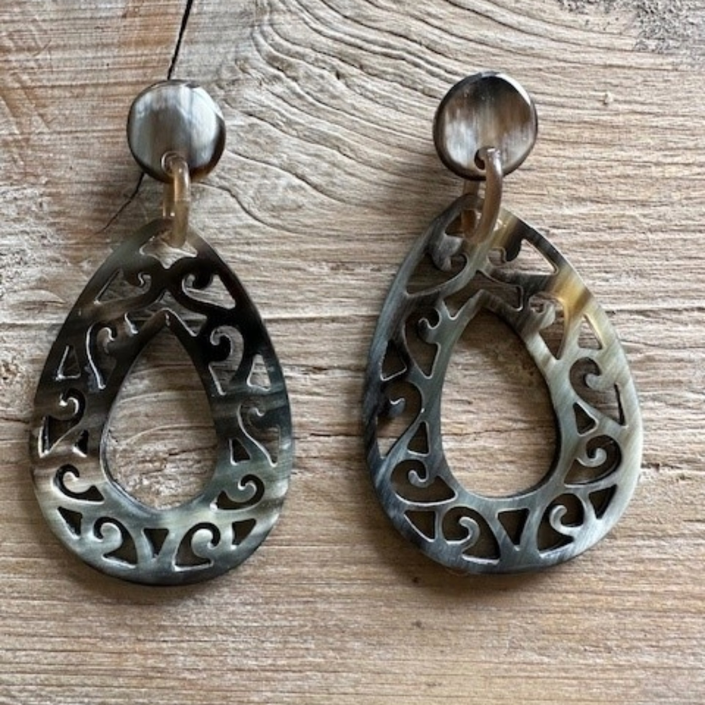 Mooie, stijlvolle, handgemaakte oorbellen van buffelhoorn met studs. Prachtig uitgesneden.