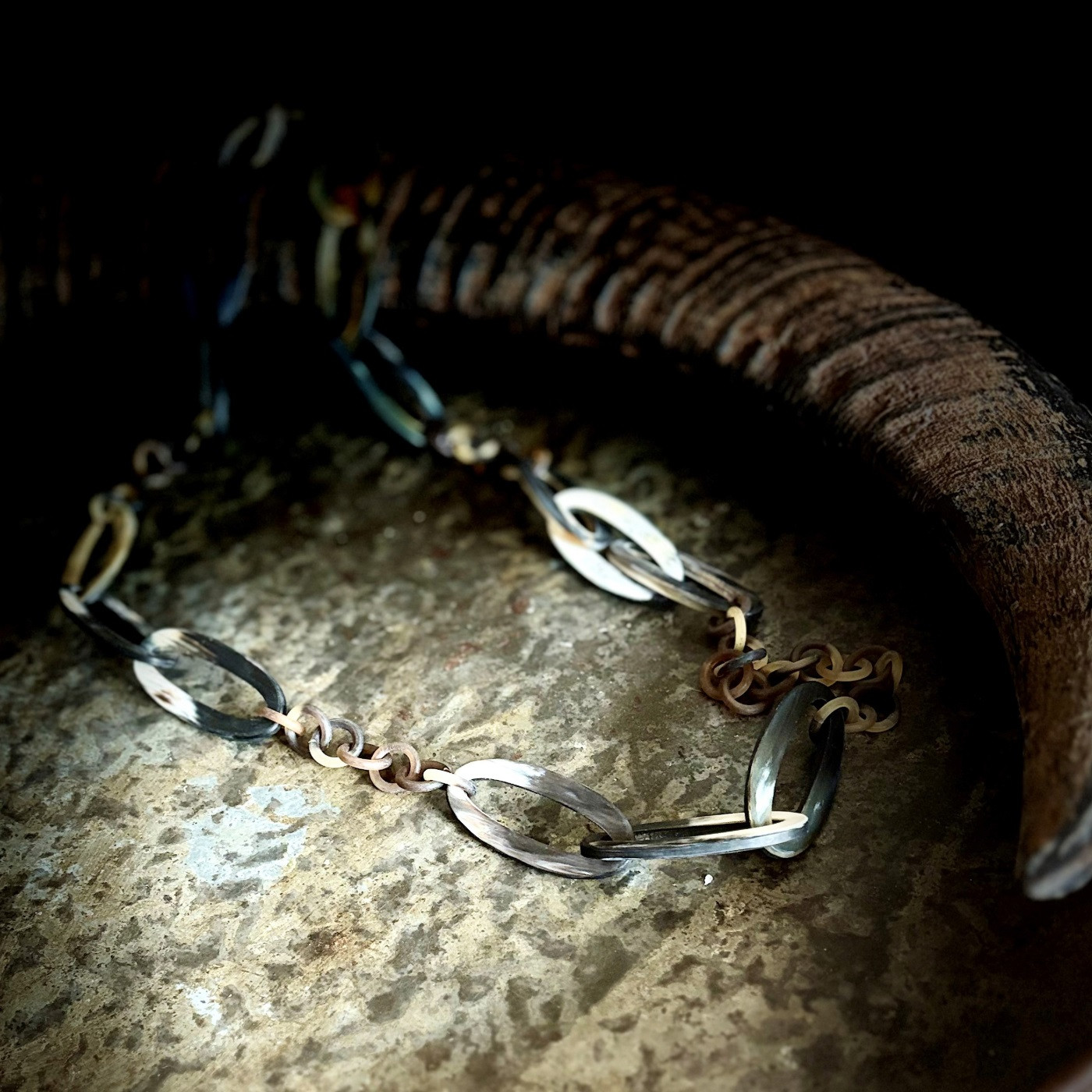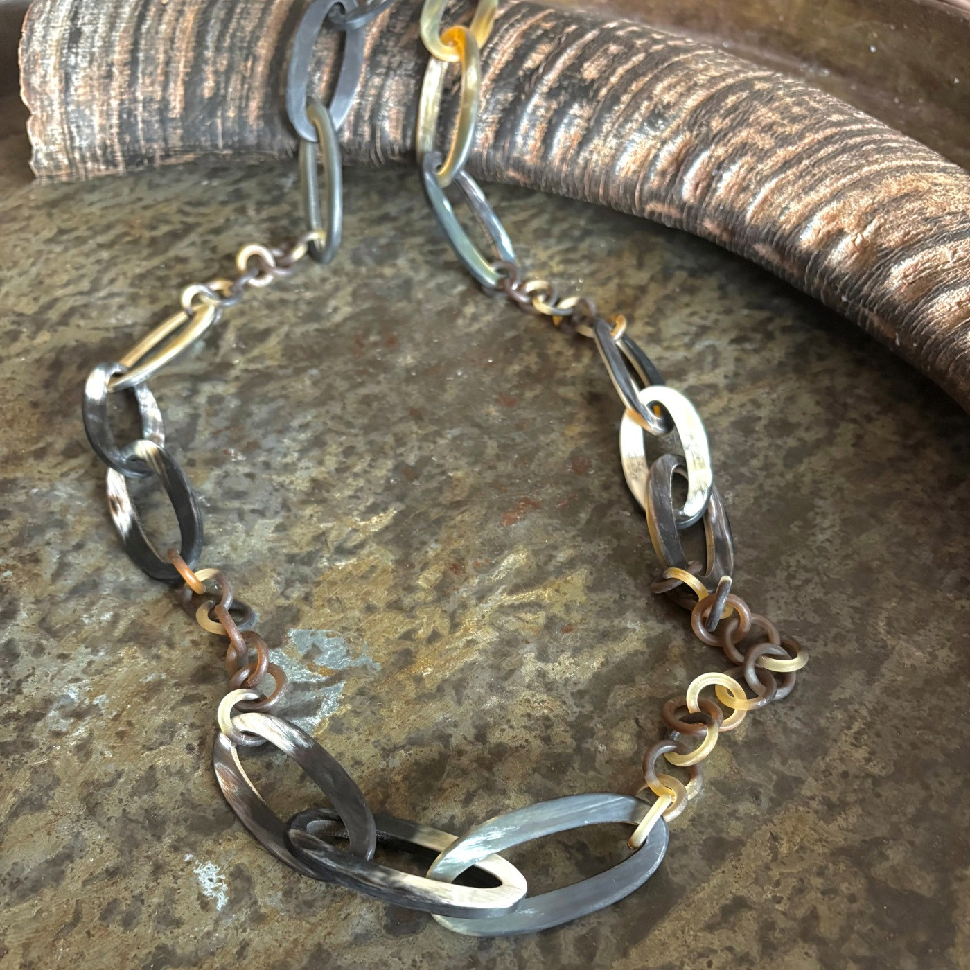 Lengte van deze mooie handgemaakte buffelhoorn ketting is 116 cm. Zwart geaderde tinten in matte finish.