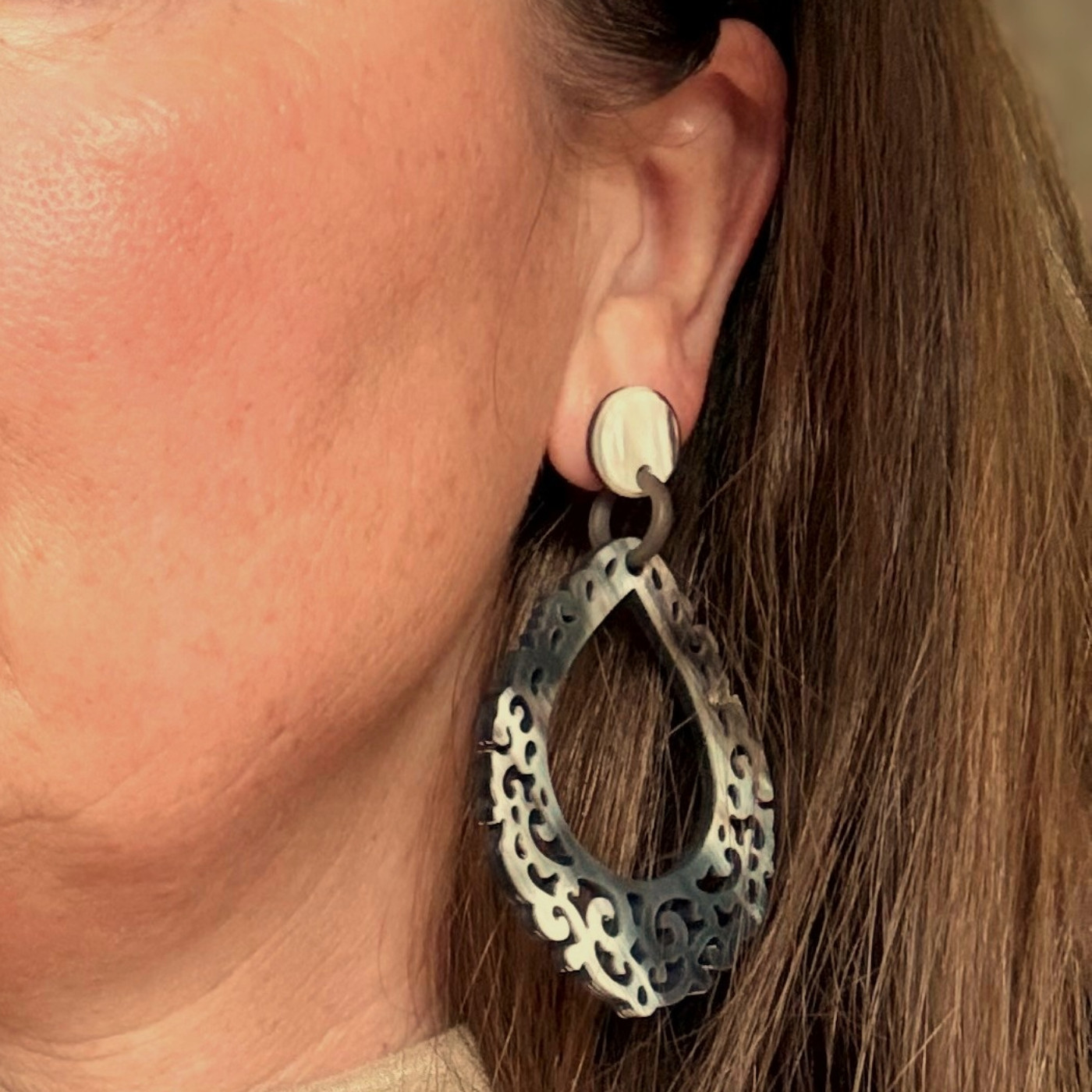 Prachtig, sierlijk bewerkte en stijlvolle, handgemaakte filigrain buffelhoorn oorbellen. Matte finish.