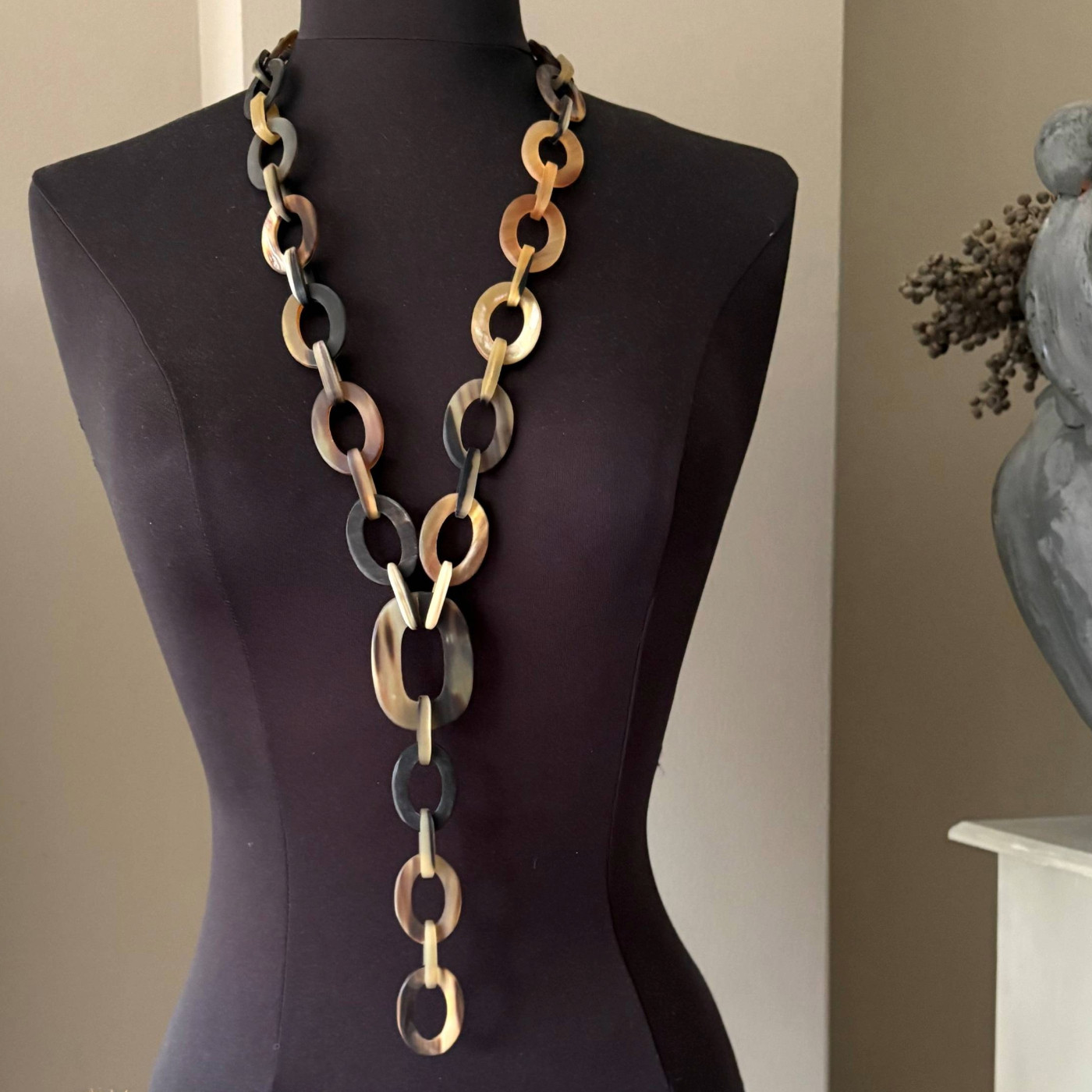 Bij dit collier is rekening gehouden, hoe de schakels aan elkaar verbonden zijn. Één kant van het collier is waar de verschillende unieke tekeningen van het buffelhoorn te zien zijn en de andere kant is de wat rustiger zijde.