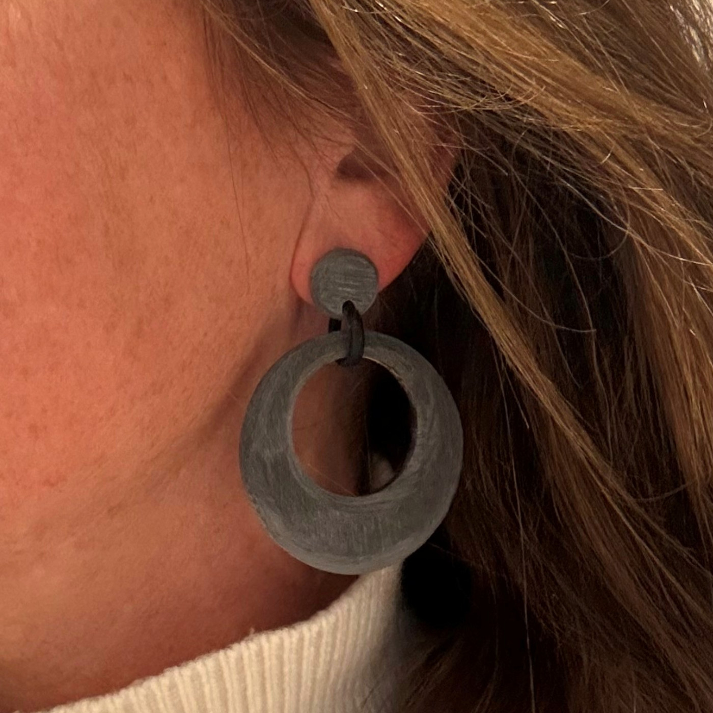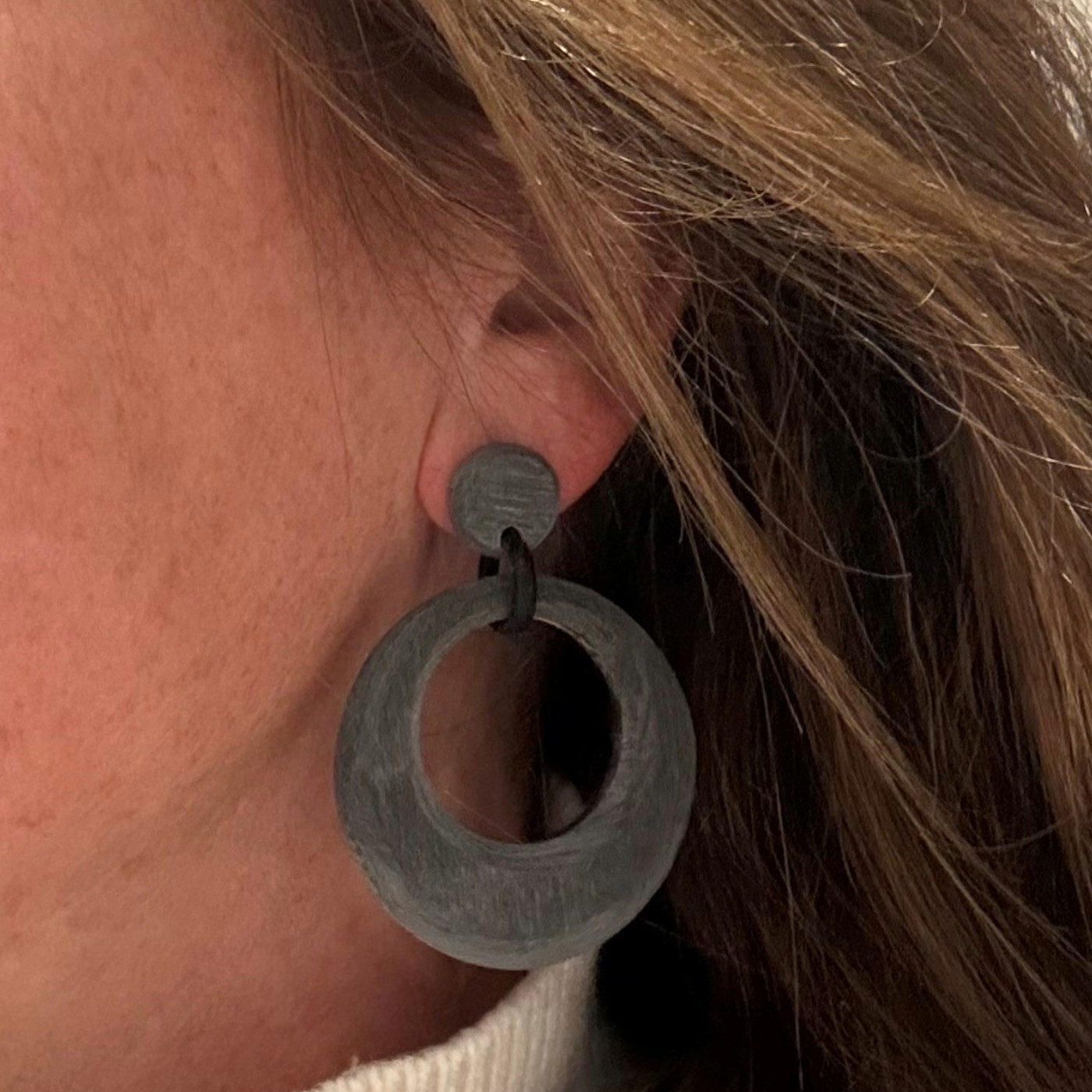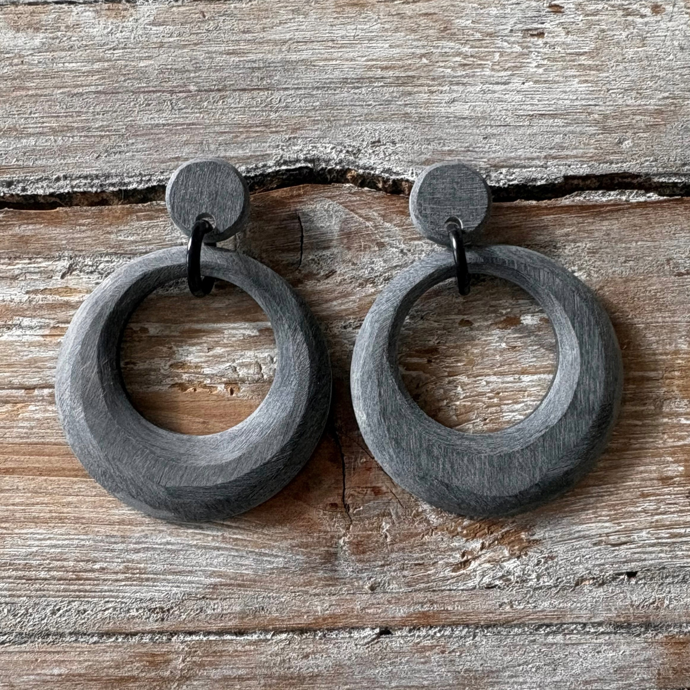 Stoere, geborstelde maanvormige buffelhoorn oorbel, mat grijs. Stijlvol, vrouwelijk en krachtig.