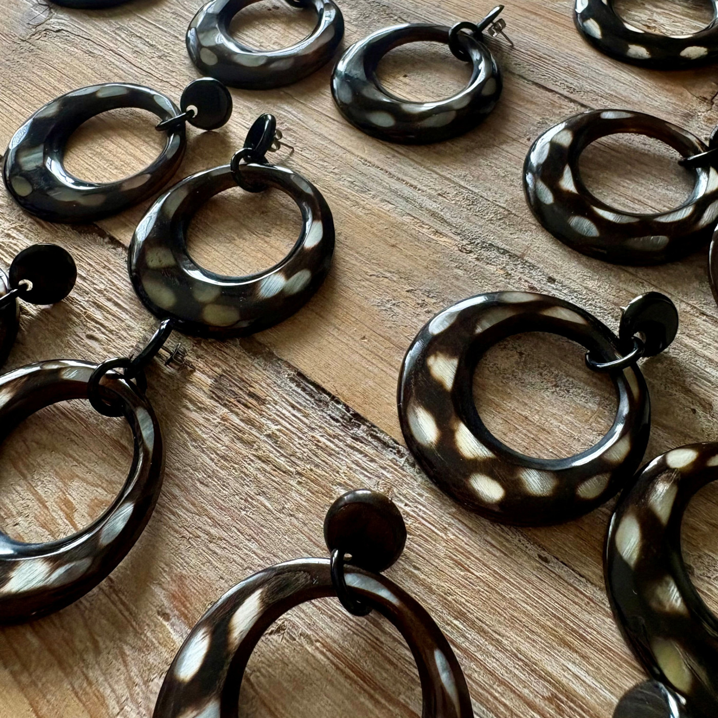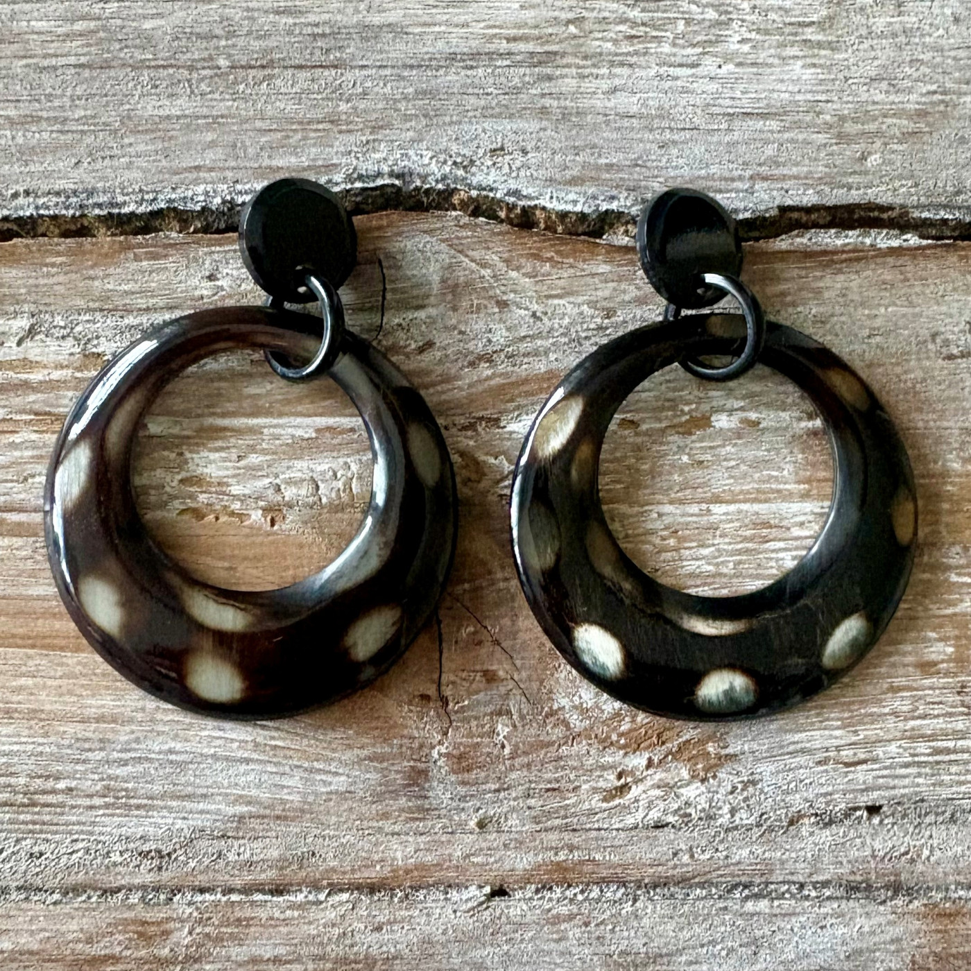 Exclusieve buffelhoorn oorbellen, maanvormig, met stippen.