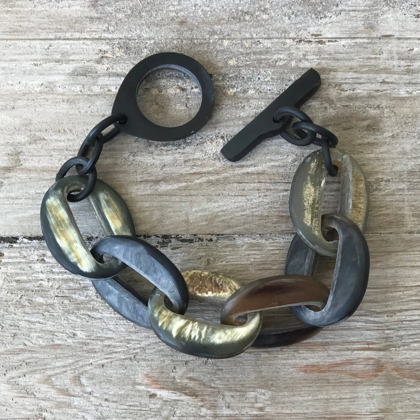 Omdat buffelhoorn een natuurproduct is, is elke armband weer uniek.