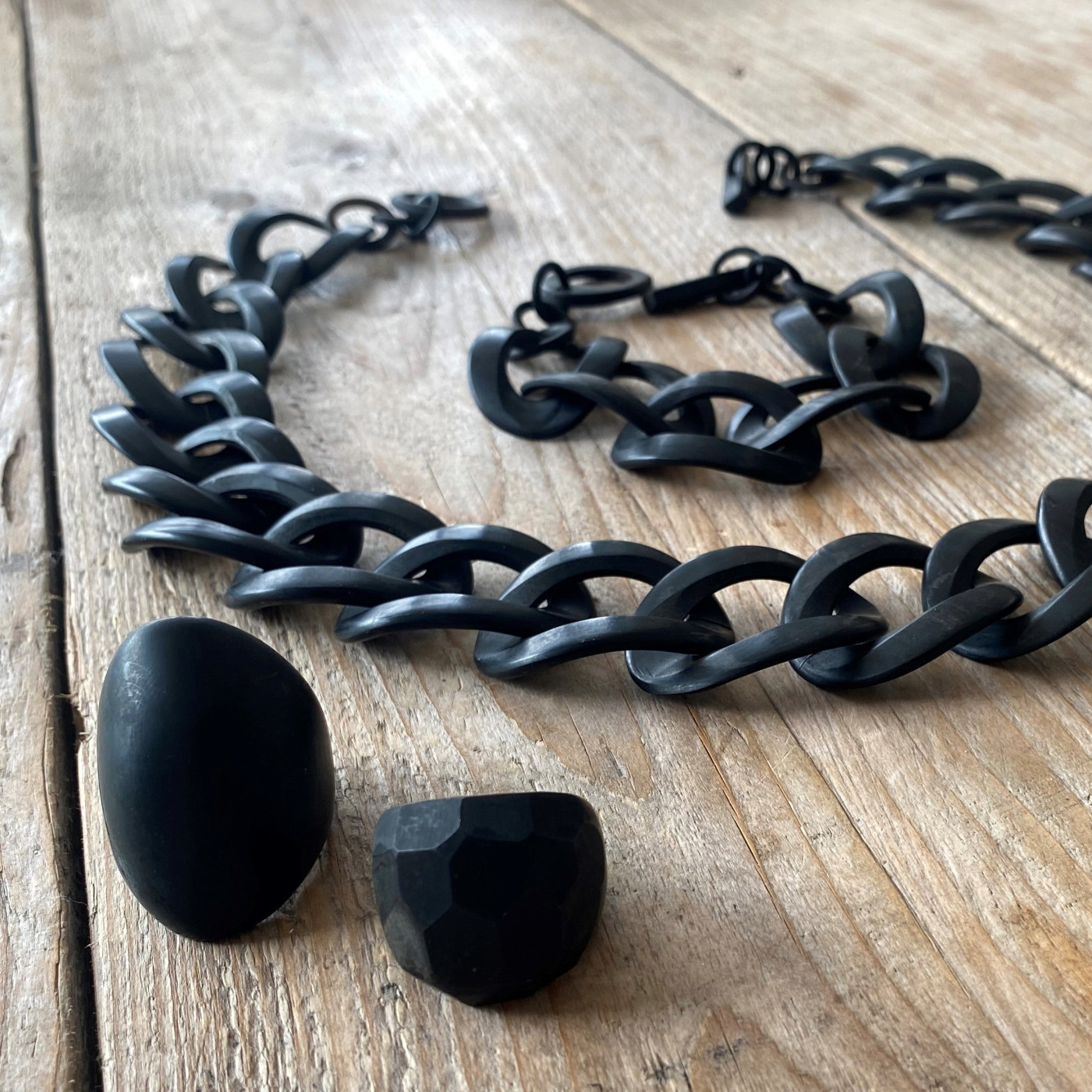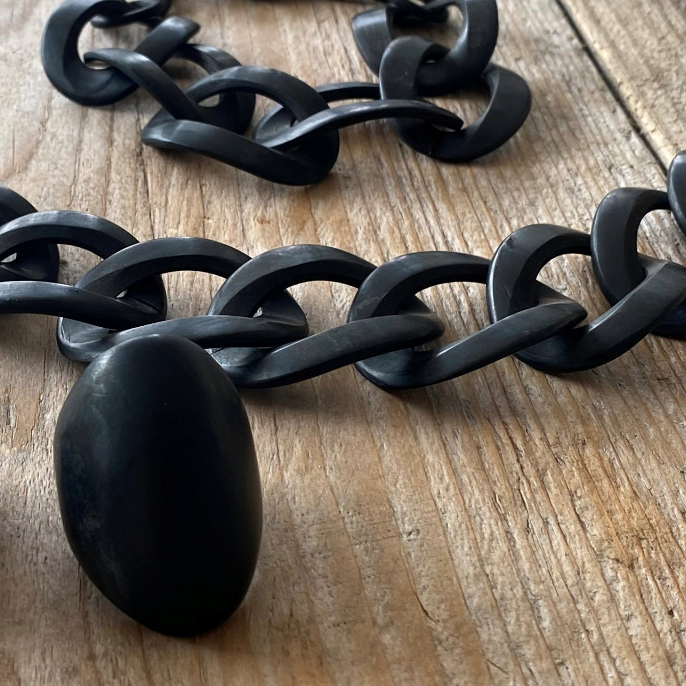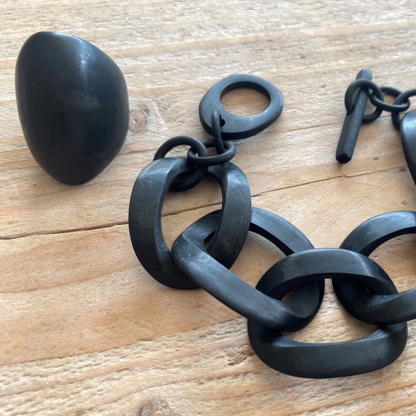 Stoere handgemaakte buffelhoorn ring in mat zwart en heeft een afmeting van ongeveer 4 cm.